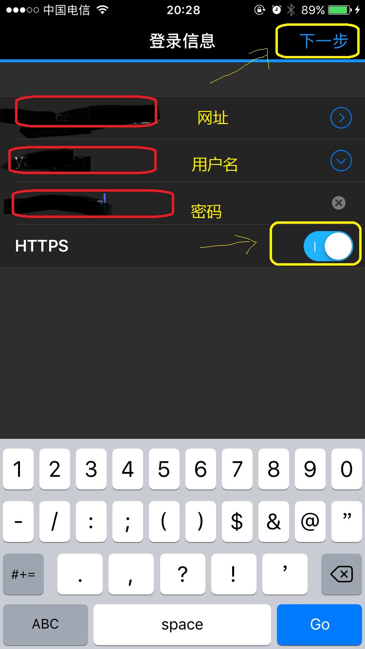 二、打开,按下面方式录入数据,给我发你的网址,用户名密码(一定要选定HTTPS):